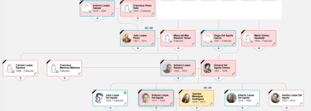 Y ya en tiempos más cercanos y con más datos entramos en la figura del bisabuelo materno que es desde donde empezó toda esta historia para tirar del hilo en esta y en la rama paterna, Antonio Luque Ramírez, del que escribí una entrada hace más de 4 años, en 1909 se casa con la bisabuela Dolores del Águila, nacida en Almería en 1891, 4 hijos tendrán, mi abuelo Antonio Luque del Águila (1917) y mis tíos abuelos Julio (1916), Alberto (1919) y Amelia (1923)…a todos ellos los pude conocer y especialmente agradecido no solo a mis abuelos, mi tía abuela Amelia no hay nada como el paso del tiempo para darse uno cuenta como sin ellos y ella, el aquí presente sería otro tipo de persona probablemente, pero crecer con ellos fue una gran satisfacción , mi tío Alberto se fue siendo yo un casi adolescente y a mi tío Julio, por la distancia apenas si lo conocí, hoy a todos ellos les estaría preguntando sobre este árbol.