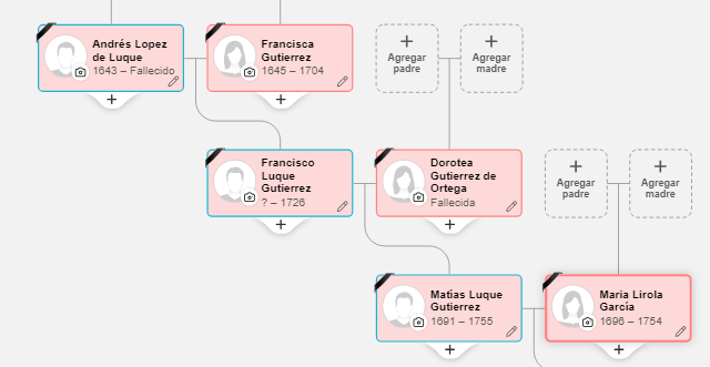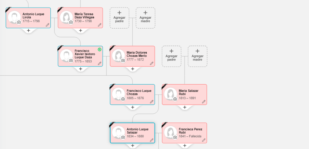 Francisco Xavier Luque nacido en Dalias se casa en 1802 con María Dolores Chozas, fallece en 1853, sabemos que tuvo 4 hijos y 1 hija, ella y su primer hijo nacen en 1805, Francisco Luque (siguiente ancestro) y Encarnación Luque…de los 5 hermanos tenemos el dato de nacimiento y fallecimiento de todos menos de uno del que no tenemos ningún dato, Serafín; los otros hijos, Felipe y Nicolás conocemos el nombre de sus esposas y ambos solo tuvieron (que sepamos ) hijas. De Encarnación solo tenemos el nombre del esposo pero no aparece descendencia…por lo tanto, la línea seguiría por el ya nombrado Francisco. Ella y Nicolás fallecen en Guardias Viejas, localidad de El Ejido cercana a Dalias.